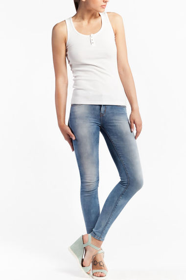 Простой облегающий топ белого цвета. Модель на широких лямках, с округлой горловиной, украшенной пуговками.